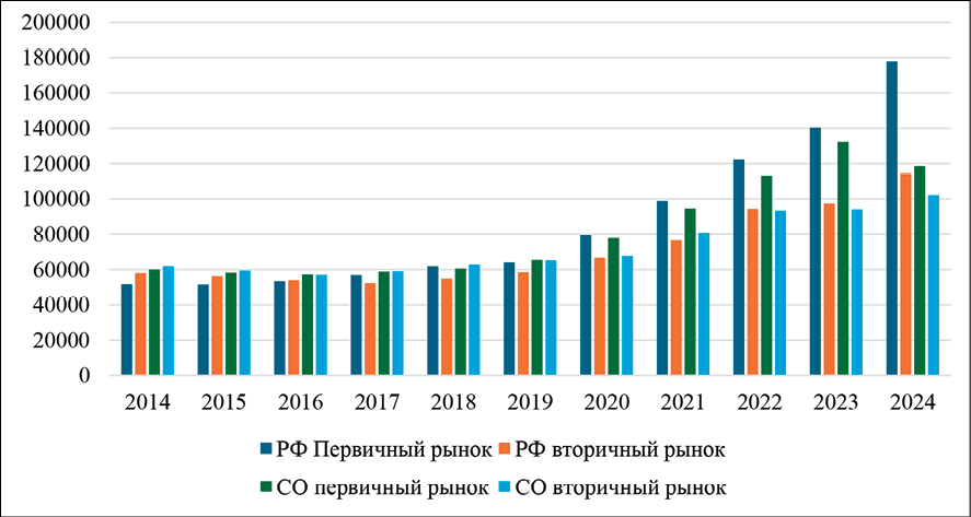 На рис. 2, составленном авторами по данным Росстата, представлена информация о динамике стоимости квадратного метра жилья как на первичном, так и на вторичном рынке. Информация представлена по Российской Федерации в целом и по Свердловской области в частности.