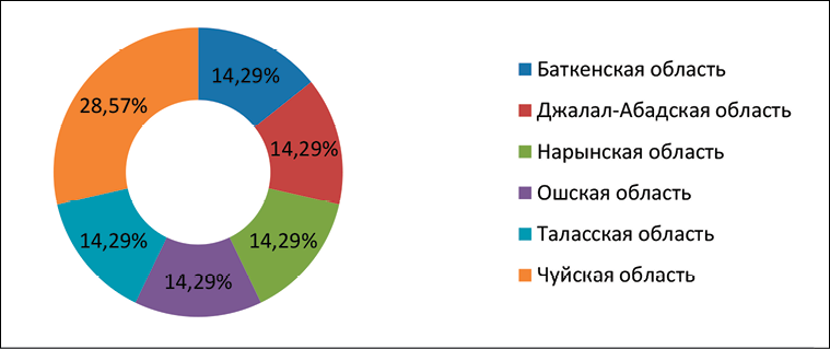 Информация о структуре государственных расходов на финансирование фестивальных проектов за 2024 г. в разрезе областей Кыргызской Республики представлена в таблице и на рисунке. Как видно, структура расходов на финансирование фестивалей коррелирует со структурой государственных расходов на финансирование социально-культурной сферы Кыргызстана, когда основной объем выделяемых средств приходится на Чуйскую область.