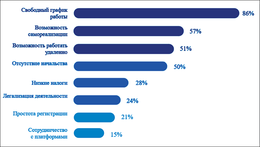 По гендерным предпочтениям на первом месте и для мужчин, и для женщин оказался «свободный график работы» (70,7 % мужчин и 75,4 % женщин). На второе место женщины поставили «возможность самореализации» (60,1 %), тогда как мужчины – «свободу, отсутствие начальства» (46,6 %). Третье место у мужчин заняла «возможность самореализации (43,1 %), у женщин – «свобода, отсутствие начальства (57,1 %). По остальным преимуществам зафиксированы незначительные расхождения.
