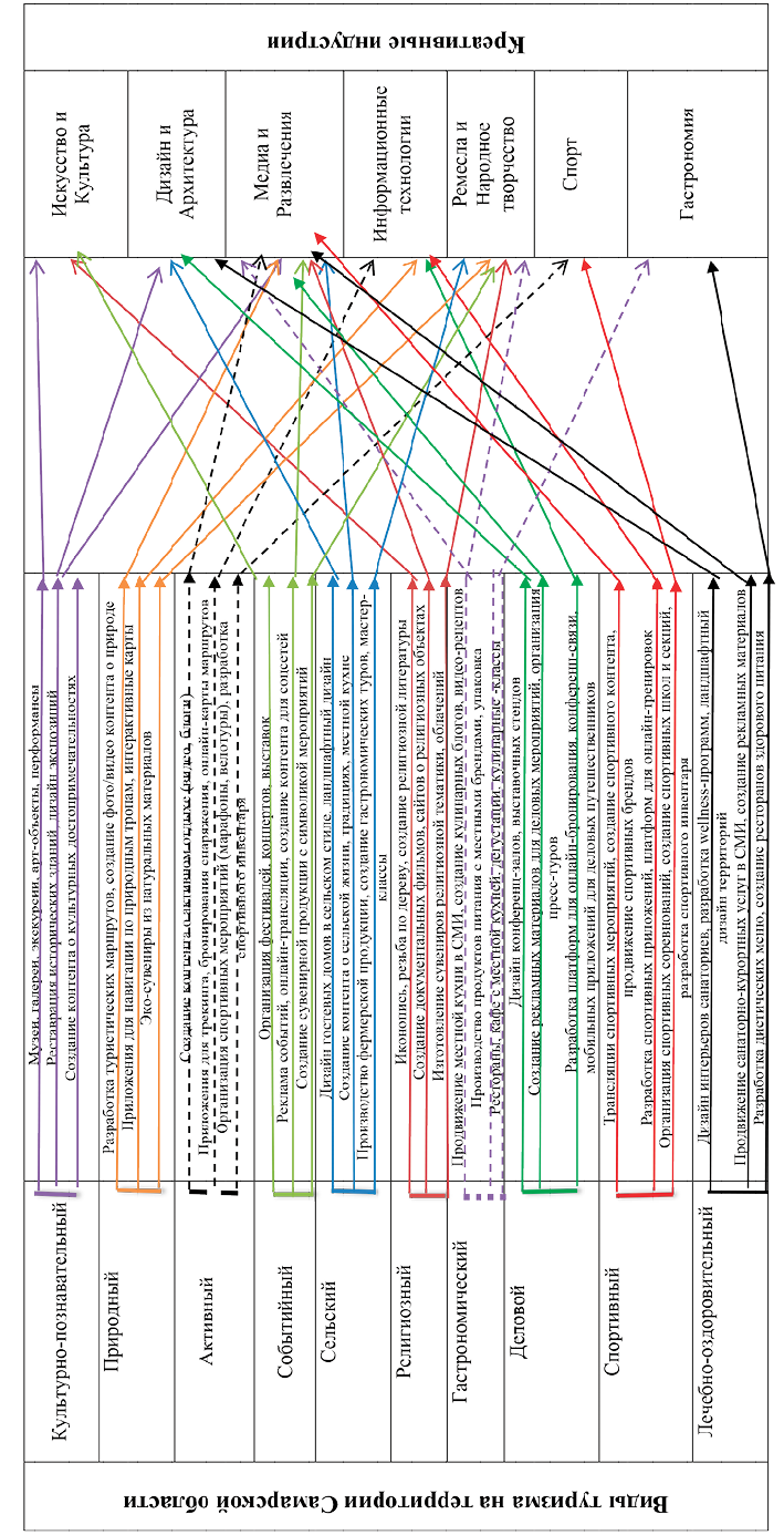 При этом все виды туристской деятельности, которые представлены и развиваются в Самарской области [16], отраженные на рис. 1, взаимосвязаны с другими сферами креативных индустрий. На рис. 2 представлены такие взаимосвязи. Цель рисунка – продемонстрировать мультимодальную схему взаимосвязей между типами туризма, развиваемыми на территории Самарской области, и креативными индустриями, обеспечивающими поддержку, сервисы и добавленную стоимость для каждого типа туризма.