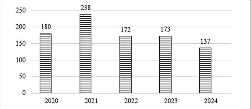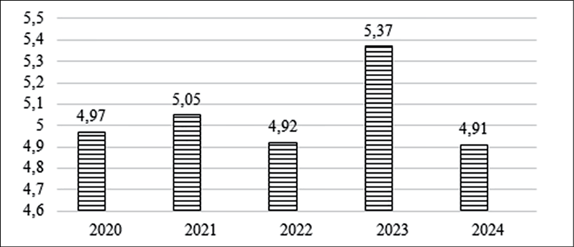 Рыбная отрасль РФ в последние годы демонстрирует показатели вылова водных биоресурсов на уровне около 5 млн т в год. Так, в 2023 г. объем вылова превысил 5,3 млн т, что на 9,1 % больше, чем в 2022 г.; это наиболее высокий уровень за рассматриваемый период. Однако в 2024 г. добыча снизилась, главным образом за счет неудачной лососевой путины. В 2025 г. плановый показатель установлен на среднестатистическом уровне в 5 млн т [1]. Динамика объемов вылова водных биоресурсов в 2020–2024 гг. представлена на рис. 1.
