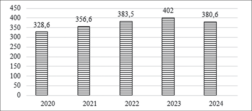 Рис. 2. Объем производства товарной аквакультуры в РФ в 2020–2024 гг., тыс. т Источник: составлено автором на основе данных Федерального агентства по рыболовству, Росстата