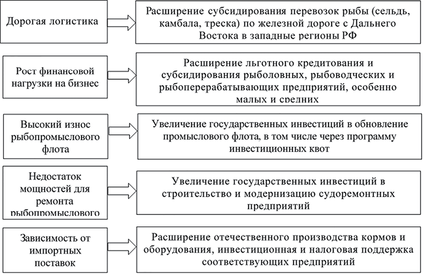 По мнению автора, для их решения необходимо сосредоточить усилия на снижении логистических затрат, увеличении инвестиций в обновление рыбопромыслового флота, обеспечении возможности комплексного ремонта крупнотоннажных судов в РФ, поддержке малых и средних предприятий рыбохозяйственного комплекса, особенно расположенных на прибрежных территориях.