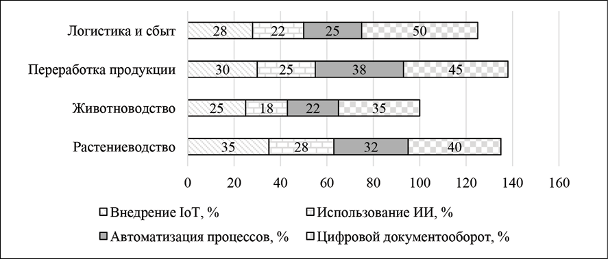 Анализ отраслевой структуры цифровизации российского АПК выявляет существенные диспропорции в уровне технологического развития различных сегментов агропромышленного комплекса (рис. 2).