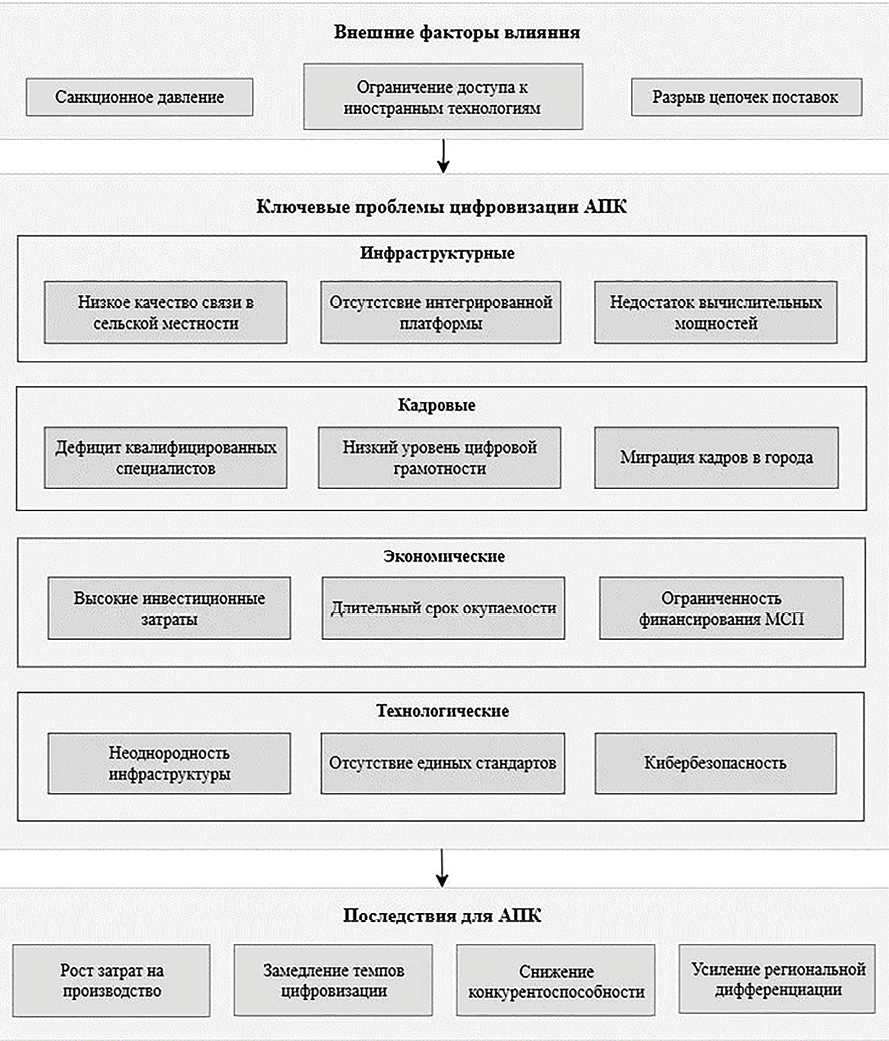 Рис. 3. Структурно-логическая схема системных проблем цифровой трансформации агропромышленного комплекса в России Источник: составлено авторами по результатам данного исследования
