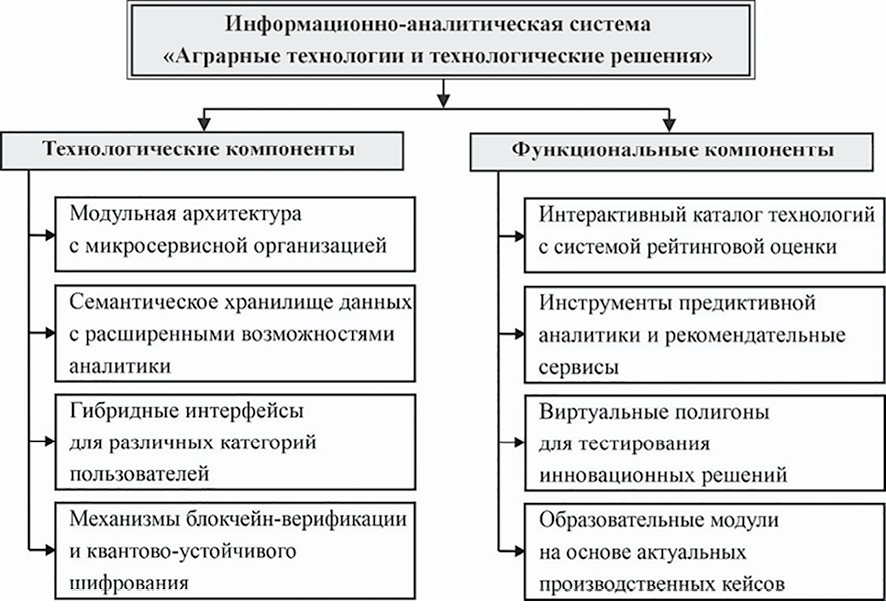 Для повышения эффективности цифровой трансформации предлагается создание информационно-аналитической системы «Аграрные технологии и технологические решения», включающей технологический и функциональный компоненты (рис. 4).