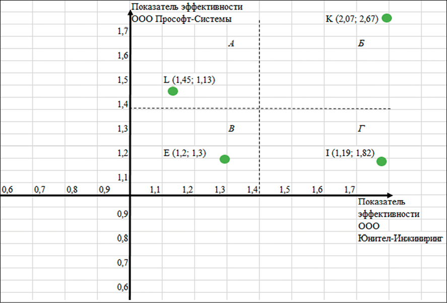 Показатель динамической конкурентоспособности ООО «Юнител-Инжиниринг» со значением 2,67 превысил ее уровень у ООО «Прософт-Системы» (2,07), что отражено в квадранте Б матрицы и означает более высокий потенциал повышения конкурентоспособности в будущем.