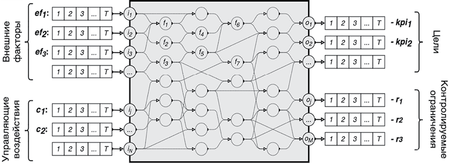 Таким образом, для достижения ключевой цели финансового менеджмента предприятиям необходимо решать задачу многоцелевой оптимизации ключевых финансовых показателей с ограничениями на показатели финансовой устойчивости. При этом и оптимизируемые финансовые показатели и используемые ограничения представляют собой динамические ряды с рекуррентными зависимостями, а концепция временной стоимости денег требует принимать во внимание также то, в какие моменты времени достигаются оптимальные значения (чем раньше, тем лучше). Очевидно, попытка решать данную задачу аналитическими методами будет сопряжена с существенными трудностями. При этом существует класс алгоритмов, использующих методы машинного обучения, позволяющих успешно автоматизировать процесс аппроксимации множества Парето – множества недоминируемых решений задачи многокритериальной оптимизации [17–19].