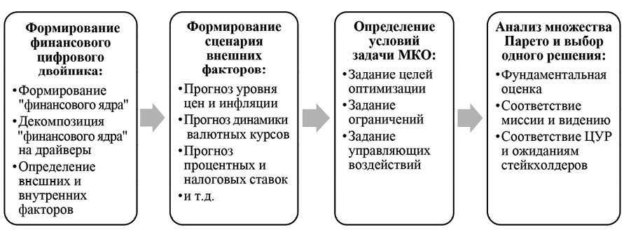 После того как сформирован финансовый цифровой двойник, необходимо сформировать прогнозный сценарий динамики изменения внешних факторов – параметров будущих состояний внешней экономической системы (уровни цены и инфляция, валютные курсы и процентные ставки, уровни занятости и зарплаты, ставки налогов и пр.). Задача формирования данных прогнозов является крайне нетривиальной, так как при прогнозировании параметров, описывающих состояние внешней экономической системы, важно принять во внимание текущую стадию экономического цикла, а также возможные политические решения, социальные тренды и множество других аспектов. В этой связи наиболее рациональным решением является использование макропрогнозов от специализированных агентств, а также таких профильных учреждений, как Центральный банк, Министерство финансов, Министерство промышленности и торговли, Министерство экономического развития и т.п.