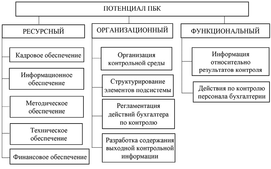 Возможность разделения СВК на подсистемы основывается на таком свойстве, как «структурированность». Именно это свойство подчеркивает объективность выделения такой подсистемы, как контроль в деятельности учетного персонала, и наличие в ней отдельных элементов: объектов, субъектов и процесса. Каждый из элементов имеет различные свойства, различные возможности, а главное – целевую направленность, что в совокупности можно рассматривать как потенциал подсистемы: ресурсный, организационный и функциональный (рис. 1).
