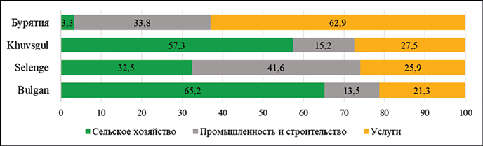 Территория трансграничных районов России и Монголии является огромной по площади (541,8 тыс. км2). Плотность населения трансграничных аймаков Bulgan и Khuvsgul выше в 2 раза аналогичного показателя Республики Бурятия. Структура ВРП трансграничных аймаков Монголии характеризуется высоким удельным весом сельского хозяйства в ВРП (32,5-65,2%). Для аймака Selenge характерен высокий удельный вес горнодобывающей промышленности (в 2022 г. добыто 3925 тыс. т железной руды, 22,7 кг золота) (табл. 1).