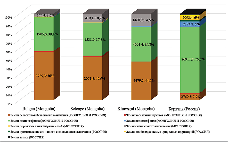 Высокий удельный вес земель лесного фонда характерен для трансграничных территорий обеих стран. К землям специального назначения Монголии относятся земли ООПТ, приграничные территории, территории, выделенные для нужд национальной обороны и безопасности (3,6-14,6%).