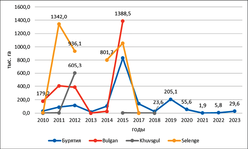 Рис. 3. Площадь лесных земель, пройденная пожарами Источник: составлено авторами на основе данных Территориального органа Федеральной службы государственной статистики по Республике Бурятия [1] и National Statistics Office of Mongolia [2]