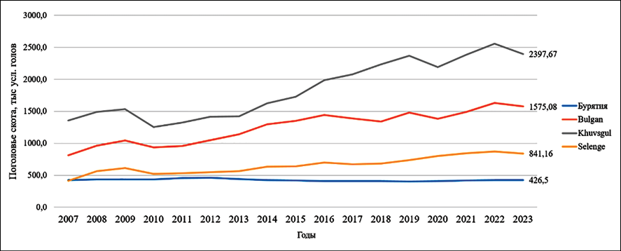 Сельское хозяйство. Ведущей отраслью экономики Монголии является пастбищное животноводство, которым занимаются преимущественно на семейной основе [12]. Традиционно номады разводят 5 видов скота: лошади, КРС, верблюды, овцы и козы. В 2022 г. доля кочевых домохозяйств составляла: Bulgan – 80,0%, Khuvsgul – 89,2%, Selenge – 52,3%. Отличительной особенностью домохозяйства Монголии является проживание в расширенной семье, т.е. состоящей из нескольких поколений [13]. В экономически сложных условиях люди объединяют ресурсы и живут вместе для взаимной поддержки. В Монголии пожилые женщины чаще (более 50%), чем пожилые мужчины (более 40%), живут в расширенных семьях [14; 15]. В период с 2007 по 2023 г. заметен значительный рост поголовья в исследуемых аймаках Монголии (рис. 4). В 2023 г. наибольшее поголовье скота на рассматриваемых территориях наблюдалось в аймаке Bulgan, наименьшее – в Республике Бурятия.