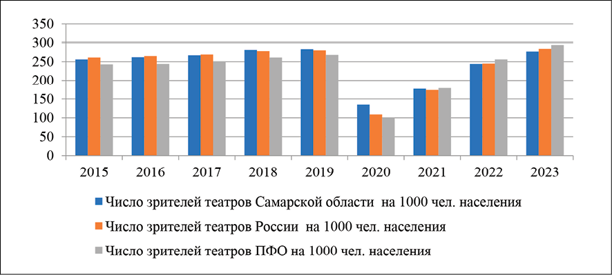 Как показывают данные рис. 2, за период с 2020 по 2023 г. наблюдается резкий рост относительного показателя числа зрителей театров. Показательным является падение посещаемости в 2020 г., очевидно, связанное с пандемией COVID-19 и ограничениями, и последующее восстановление до уровня, близкого к допандемийному, при продолжающемся снижении численности населения. При этом показатели посещаемости по Самарской области в последние годы меньше общероссийского показателя и показателя ПФО. Причинами данных тенденций могут быть демографические, социально-культурные, экономические и другие факторы.