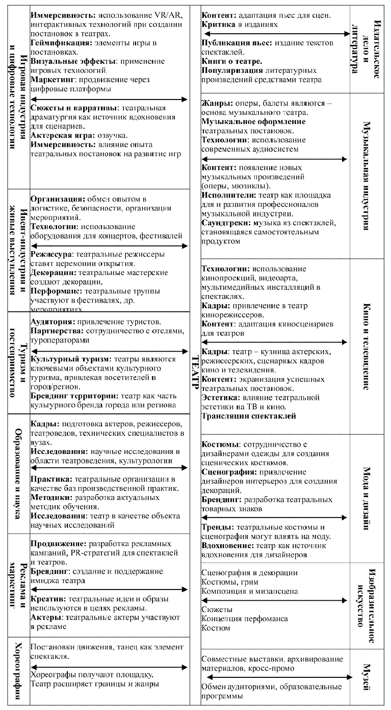 Схема, приведенная на рис. 3, показывает, что современный театр, чтобы быть экономически устойчивым и актуальным, должен активно выстраивать взаимоотношения с другими креативными индустриями, используя их ресурсы, технологии и каналы для развития собственного потенциала и расширения своего влияния.