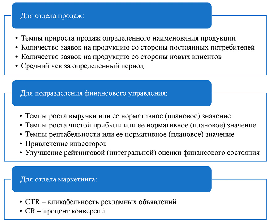 – наличие стратегических целей и задач развития организации с разбивкой по направлениям деятельности его подразделений. Например, может проводиться оценка по целям исходя из частных целей для отдельных подразделений. Цель стратегического развития предприятия: повышение конкурентоспособности (оценка по характеристикам продаж, качества продукции, рационального взаимодействия с органами государственного контроля и регулирования). В данном случае для отдела бухгалтерии могут устанавливаться цели отсутствия штрафных санкций в части ведения бухгалтерского учета и составления отчетности (финансовой, налоговой, статистической). Для отдела продаж будут устанавливаться цели увеличения объема продаж по отдельным наименованиям продукции. Для производственных служб будут формироваться метрики качества продукции (информация формируется в рамках лабораторных исследований или обратной связи от покупателей / клиентов) и т.д.