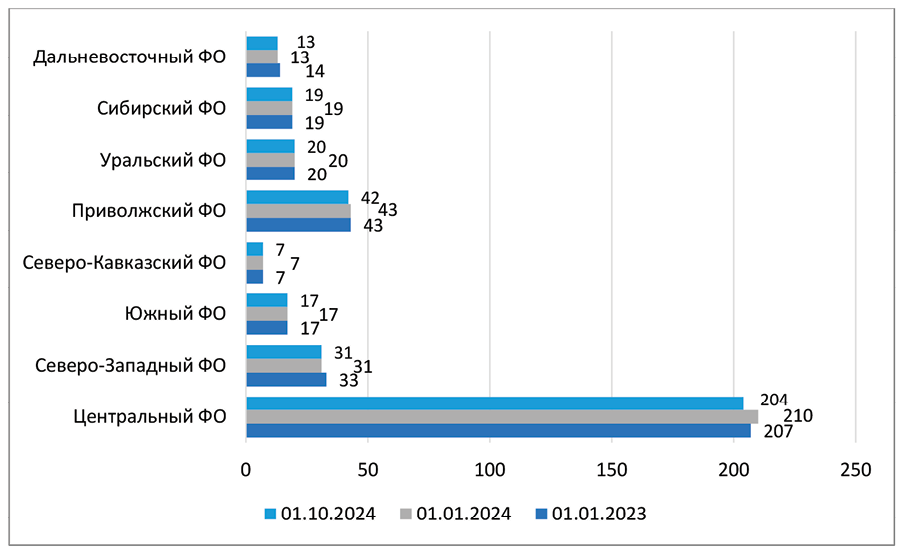 Рис. 1. Динамика количества кредитных организаций по федеральным округам, 2023-2024 гг. Источник: составлено авторами на основании отчета Центрального банка «Статистические показатели банковского сектора Российской Федерации» № 266 за октябрь 2024 г. (Таблица 11. «Размещение и активы действующих кредитных организаций в разрезе ФО и регионов»)