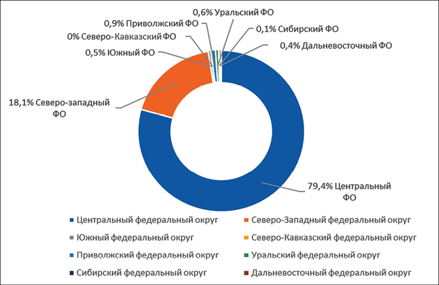 Анализ активов кредитных организаций в разрезе федеральных округов по отношению к активам банковского сектора РФ по состоянию на 01.10.2024 показывает, что наибольшая доля активов банковского сектора сосредоточена в Центральном федеральном округе и составляет 79,4%, на втором месте находится Северо-Кавказский федеральный округ – 18,1%, и на остальные федеральные округа в совокупности приходится 2,5% (рис. 2).