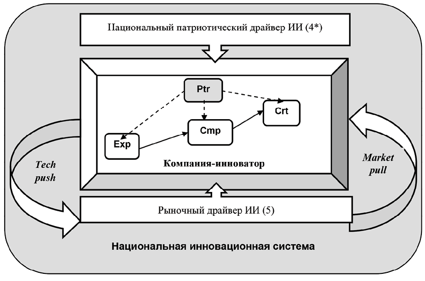 Модель «пентаполь драйверов императива инноваций» Примечание. Драйверы императива инноваций (ИИ): Exp – компетентностный (1); Cmp – конкурентностный (2); Crt – креативностный (3); Ptr – патриотический (4); Tech push – технологическое продавливание, то есть деятельность компании-инноватора по продвижению новых продуктов; Market pull – рыночное втягивание, то есть сформировавшиеся запросы рынка/государства на удовлетворение обнаруженных потребностей, которое не может быть обеспечено существующими продуктами/услугами Источник: составлено авторами