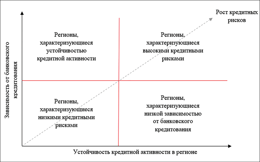 На базе оценки степени участия кредитных учреждений в системе формирования финансовой базы реального сектора экономики, а также устойчивости кредитной активности банковской сферы может быть построена двухмерная матрица, позволяющая выявить регионы, для которых в наибольшей степени характерны риски снижения банковского кредитования корпоративного сектора (рис. 1).