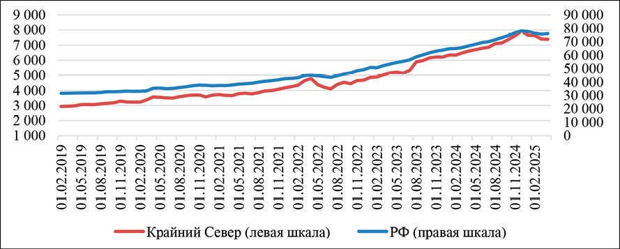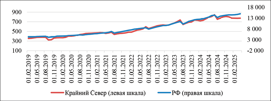 Оценивая отдельно динамику показателей задолженности по кредитам, предоставленным МСП, следует отметить более высокие темпы роста по данному показателю в РФ относительно Крайнего Севера (задолженность с 2019 года по РФ выросла в 3,5 раза при аналогичном показателе по Крайнему Северу 2,2 раза). Наиболее ярко отклонение кредитования МСП в анализируемой группе регионов относительно общероссийской тенденции наблюдается с середины 2024 г. по май 2025 года.