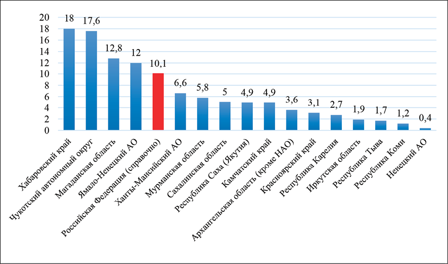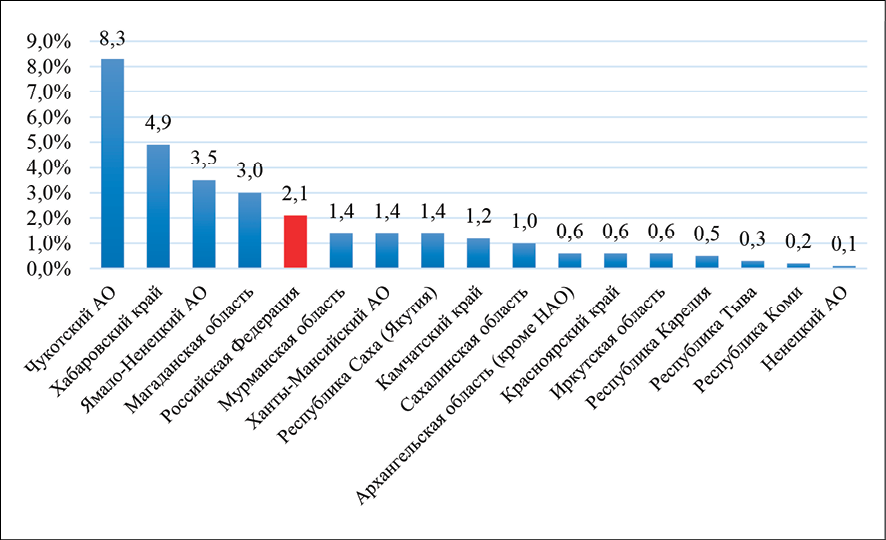 При всей схожести тенденций в области корпоративного кредитования в РФ и на Крайнем Севере следует отметить, что показатели значимости кредитования по отдельным регионам существенно отличаются (рис. 3).