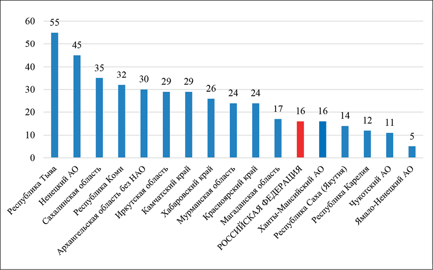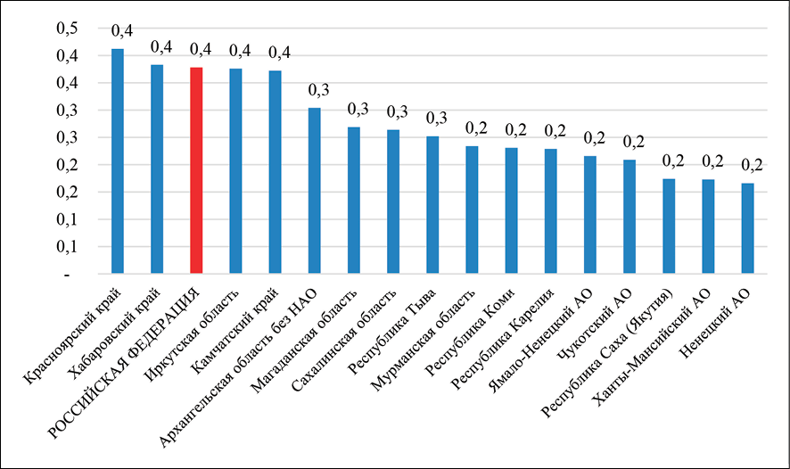 Рис. 4. Показатели оценки значения банковских кредитов для малого и среднего бизнеса регионов Крайнего Севера, в среднем за 2019–2023 гг. Источник: составлено авторами по данным ЦБ РФ. URL: https://cbr.ru/statistics/bank_sector/sors/ (дата обращения: 16.10.2025).