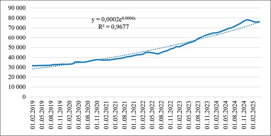 Рис. 5. Динамика общей задолженности по кредитам, предоставленным юридическим лицам – резидентам и индивидуальным предпринимателям в РФ в сопоставлении с трендом (экспоненциальная функция) Источник: составлено авторами по данным ЦБ РФ. URL: https://cbr.ru/statistics/bank_sector/sors/ (дата обращения: 19.10.2025).
