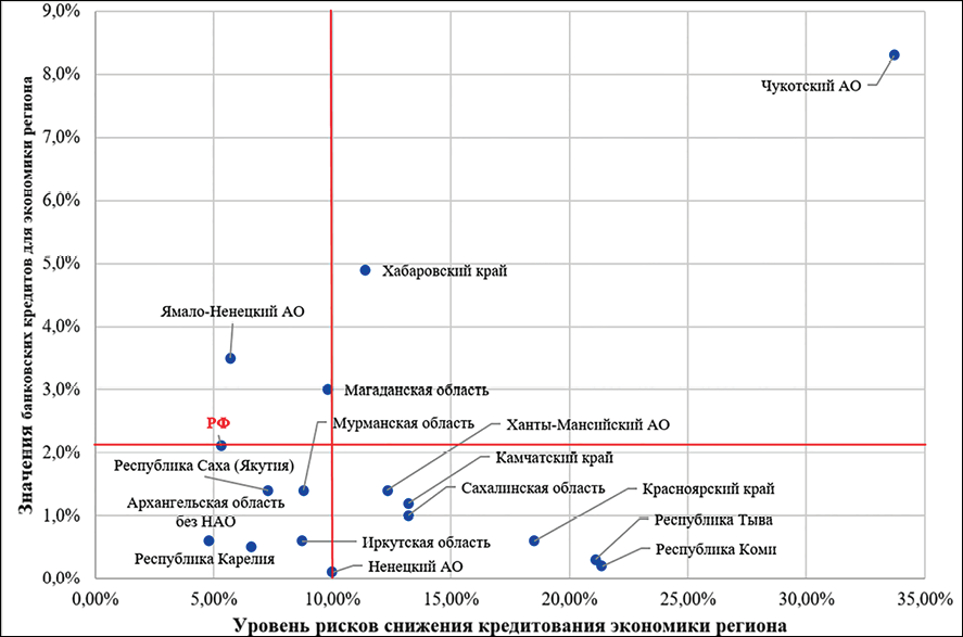 На основе анализа представленных исследований можно констатировать, что особую актуальность вопросы возможностей привлечения банковского кредитования в качестве источника реализации крупных проектов и развития реального сектора экономики приобретают в регионах, для которых характерны промышленный уклад хозяйства, высокий инвестиционный потенциал и значительная потребность в привлечении финансовых ресурсов. К таким регионам относится территория Крайнего Севера России. В связи с этим оценка рисков снижения корпоративного банковского кредитования в регионах Крайнего Севера в условиях финансовой турбулентности и монетарных шоков представляется на современном этапе особенно важной и актуальной.