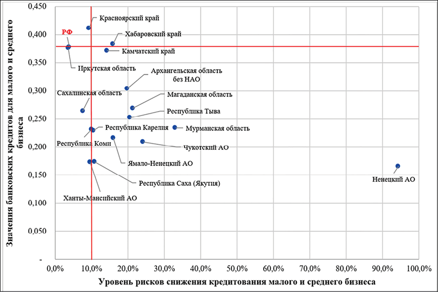 Рис. 7. Позиционирование регионов с позиций наличия кредитных рисков для малого и среднего бизнеса регионов Источник: разработано авторами