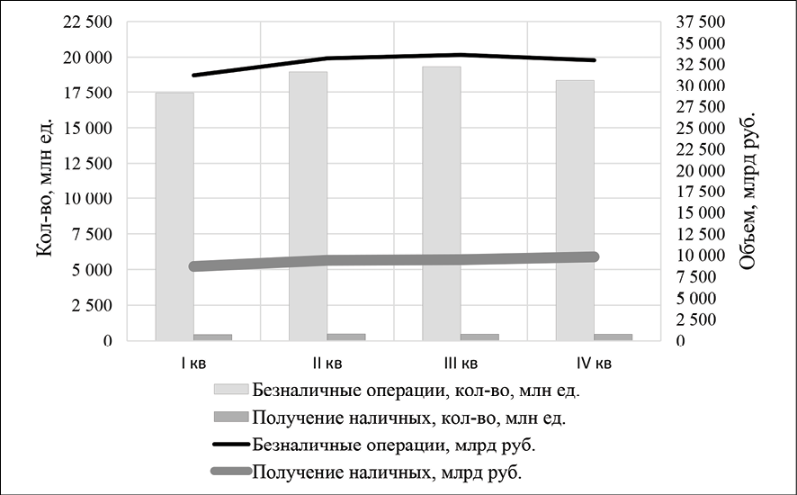 Рис. 2. Объем и количество наличных и безналичных операций за 12 месяцев 2024 г. Примечание: составлен авторами на основании Статистики национальной платежной системы Сайт Банка России [Электронный ресурс]. URL: https://cbr.ru/statistics/nps/psrf (дата обращения: 25.09.2025)