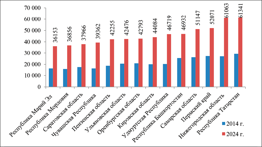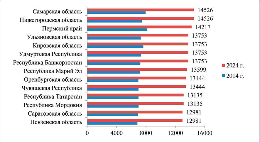Аутсайдерами как в 2014, так и в 2024 г. были Республика Марий Эл, где увеличение произошло с 16 433 до 36 153 (на 19720 руб.), и Республика Мордовия, где анализируемый показатель вырос с 15 719 до 36 856 (на 21137 руб.). Эти регионы характеризуются самым низким показателем среднедушевых денежных доходов, но прирост данного показателя у них составил более 100 %, что характерно не для всех регионов ПФО: например Самарская область, Республика Башкортостан и Пермский край имеют наименьший прирост за данный период.