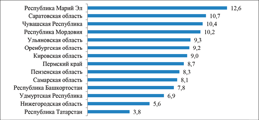 Так, наименьший процент населения с доходами ниже 0,5 границы бедности зафиксирован в Республике Татарстан (0,4 %), Удмуртской Республике (0,7 %) и Нижегородской области (0,8 %), а наибольший – в Республике Марий Эл (1,6 %), Республике Мордовия (1,6 %) и Саратовской области (1,5 %). Если рассматривать субъекты ПФО с точки зрения соотношения денежных доходов и границы бедности свыше 6,0 ГБ, то к регионам с самыми высокими значениями относятся: Республика Татарстан (20,9 %) и Нижегородская область (17,0 %); а с наименьшими вновь оказались Республика Марий Эл (4,4 %), Республика Мордовия (6,0 %) и Кировская область (6,5 %). Значительная часть населения получает доходы в интервале от 2,0 до 6,0 ГБ, что свидетельствует о приемлемом уровне благосостояния.