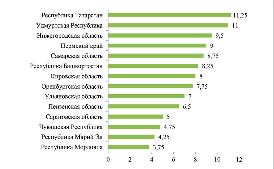 Таким образом, регионы Приволжского федерального округа было решено разделить на три кластера с установленными интервальными границами – регионы с низким (3,75 ≤ Х < 6,25), средним (6,25 ≤ Х < 8,75) и высоким (8,75 ≤ Х ≤ 11,25) значениями.