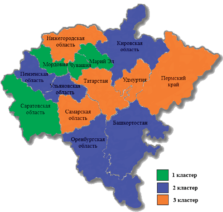 В состав первого кластера вошли Саратовская область, Республика Мордовия, Республика Чувашия и Республика Марий Эл. Во второй кластер вошли пять субъектов ПФО: Республика Башкортостан, Кировская область, Оренбургская область, Пензенская область, Ульяновская область. В третьем кластере находятся пять регионов Приволжского федерального округа, такие как Республика Татарстан, Удмуртская Республика, Пермский край, Нижегородская область, Самарская область. Стоит отметить, что наблюдается устойчивая корреляция между уровнем экономического развития (ВРП) и показателями благосостояния населения. Во-вторых, регионы с развитым промышленным сектором демонстрируют более высокие доходы населения при одновременном росте неравенства. А в-третьих, аграрно-ориентированные субъекты характеризуются повышенным уровнем бедности при относительно равномерном распределении доходов
