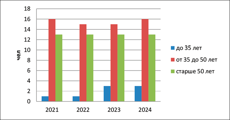 Анализ рис. 1 показывает, что при одинаковой штатной численности в 2021–2024 гг. фактическая численность государственных гражданских служащих в Министерстве здравоохранения Чувашской Республики колебалась незначительно, и поэтому также уровень недоукомплектованности менялся незначительно, но всегда присутствовал. На рис. 2 был проанализирован кадровый состав в Министерстве здравоохранения Чувашской Республики по возрасту.