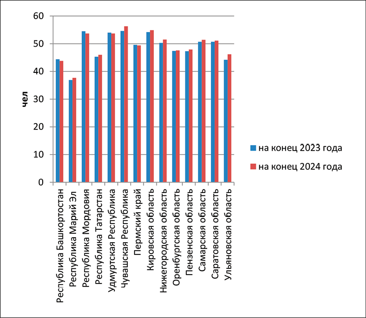 Следует констатировать, что в кадровой политике в сфере здравоохранения Чувашской Республики привлечение молодых врачей играет ключевую роль в обеспечении качественного медицинского обслуживания и сохранении конкурентоспособности региона. Было выявлено, что, по данным Территориального органа Федеральной службы государственной статистики по Чувашской Республике, на конец 2023 г. обеспеченность врачами в Чувашской Республике составила 38,1 на 10 тыс. населения, что ниже среднероссийского показателя (примерно 44–45 на 10 тыс. населения) и целевых значений, установленных Минздравом России [9]. На рис. 3 предоставлена численность врачей всех специальностей на 10 тыс. населения по Приволжскому федеральному округу 2023–2024 гг.
