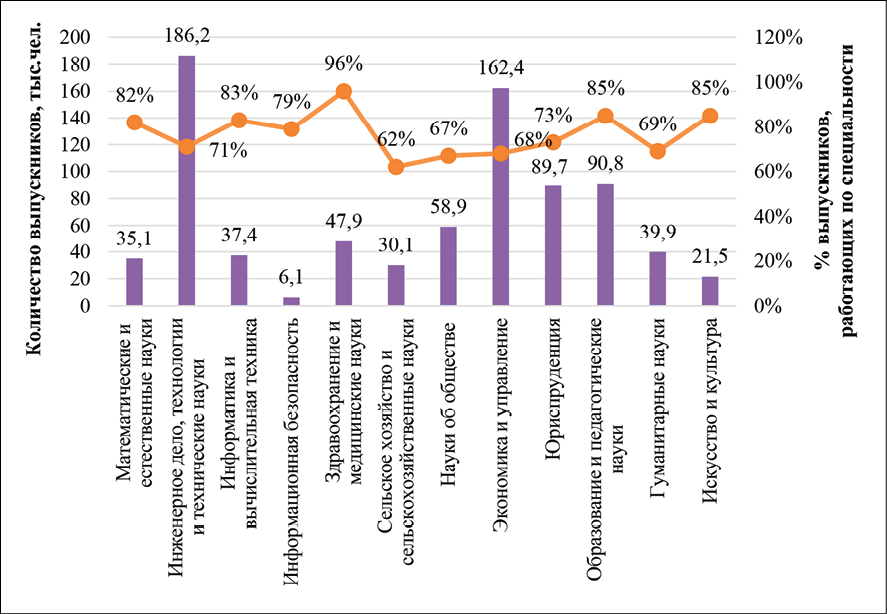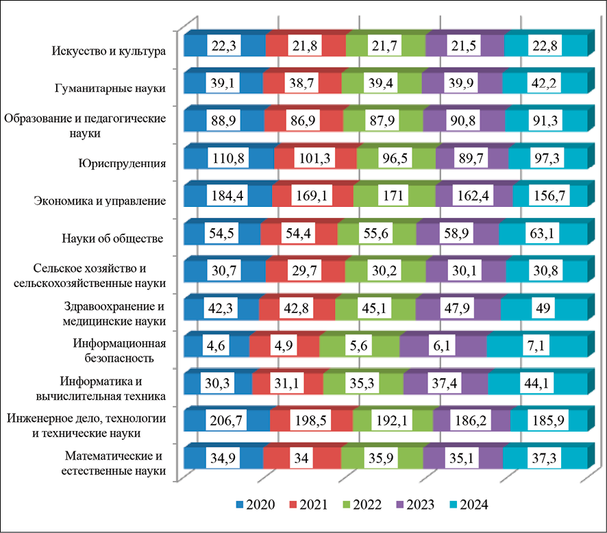 Рис. 1. Выпуск специалистов с высшим образованием по направлениям подготовки Примечание: составлен автором на основе источника: Образование в цифрах: 2025: краткий статистический сборник / Т.А. Варламова, Л.М. Гохберг, О.А. Зорина, О.К. Озерова, О.Н. Портнягина, Н.Б. Шугаль. М.: ИСИЭЗ ВШЭ, 2025. 136 с. ISBN 978-5-7598-3040-5