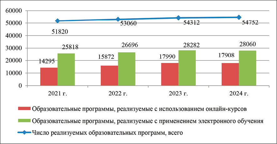 С 2021 по 2024 г. более чем в два раза увеличилось количество образовательных программ, полностью реализуемых в онлайн-формате: с 231 до 503. Также наблюдается значительный рост программ, реализуемых с использованием исключительно электронного образования: только за 2024 г. их число увеличилось со 117 до 291.