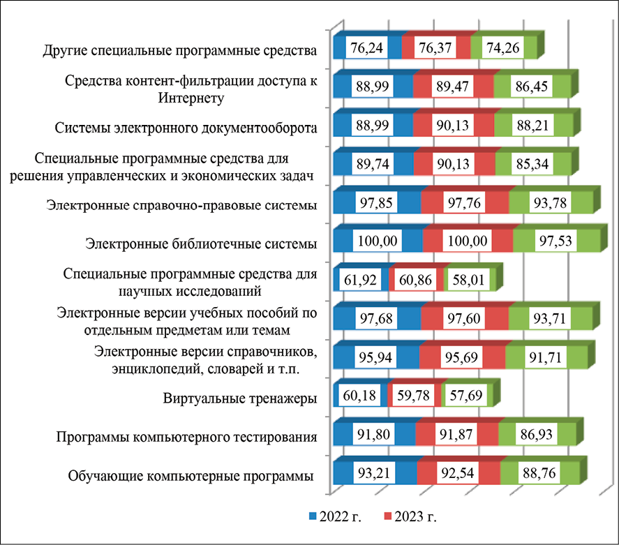 Наиболее высокий уровень использования специальных программных средств наблюдается при реализации образовательных программ. Так, практически все вузы обеспечены электронными библиотечными и справочно-правовыми системами, используют в образовательной деятельности обучающие компьютерные программы и программы для проведения тестирования, электронные версии учебных пособий и справочников. В управленческой деятельности широко применяются системы электронного документооборота, специализированные программные средства для решения задач управления вузом. Наименьший процент обеспеченности специальными программными средствами наблюдается в научной деятельности. Что касается цифровых технологий, то чаще всего в высшем образовании применяются облачные сервисы, цифровые платформы, технологии сбора, обработки и анализа больших данных [13].