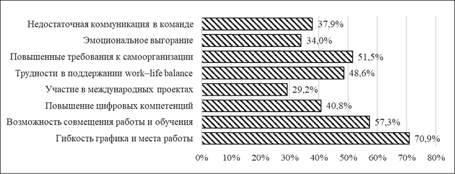 Для оценки восприятия гибридных моделей занятости было проведено эмпирическое исследование среди выпускников факультета прикладной информатики ФГБОУ ВО «Кубанский государственный аграрный университет». В опросе приняли участие 103 выпускника, окончившие обучение в период с 2022 по 2025 г. и в настоящее время осуществляющие профессиональную деятельность в гибридном формате. Структура выборки представлена следующим образом: 35,9 % женщин и 64,1 % мужчин; до 25 лет – 81,6 %, старше 25 – 18,4 %; по сфере занятости – ИТ и цифровые услуги – 40,8 %, образование и наука – 10,7 %, торговля – 22,3 %, государственное управление – 7,8 %, прочие сектора – 18,4 %.