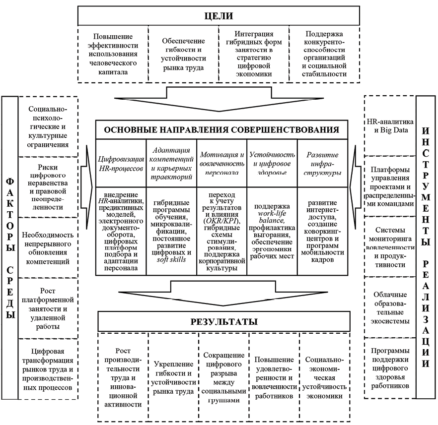 Проблемы гибридной занятости являются предметом управленческого анализа, поскольку затрагивают архитектуру HR-процессов, организационную культуру и механизмы воспроизводства человеческого капитала в цифровой среде. Таким образом, переход к гибридным формам занятости зависит от разработки концепций и инструментов управления человеческим капиталом, способных обеспечить баланс между гибкостью организации труда, социальной устойчивостью и ростом эффективности использования кадрового потенциала в цифровой экономике.