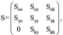 где S – структурная матрица анализируемой системы; Soo, Syy, Skk – ноль-единичные подматрицы связей элементов в внутри соответствующих подсистем; Soy, Sok , Syo, Sky – матрицы связей между элементами в отдельных подсистемах (ОУ, УО, КО соответственно).