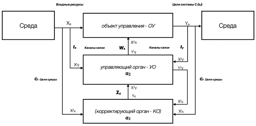 Управляющий орган (УО) информационно соединен с объектом управления (ОУ) каналом прямой связи со средой (IX) и обратной связью с объектом управления (IY). По этим связям управляющий орган через свои входы X0У и X1У получает информацию о состоянии среды и объекта управления:
