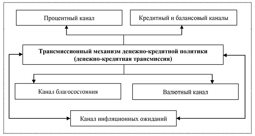 Каналы трансмиссионного механизма денежно-кредитной политики действуют синергетически, дополняют друг друга [6; 7] и в комплексе оказывают влияние на экономику с различных сторон: процентные ставки в экономике (процентный канал); изменение спроса на заемные ресурсы, переоценка обеспечения по кредитам (кредитный и балансовый каналы); состояние фондового рынка (канал благосостояния); стабильность и устойчивость рубля (валютный канал); ожидания населения и субъектов предпринимательства по будущей ценовой динамике (канал инфляционных ожиданий).