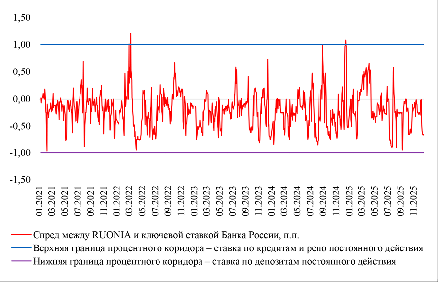 Рис. 3. Спред между RUONIA и ключевой ставкой Банка России Источник: Процентный коридор Банка России и ставки сегмента овернайт денежного рынка // Банк России. [Электронный ресурс]. URL: https://cbr.ru/hd_base/ProcStav/IRB_OMMIR/ (дата обращения: 23.12.2025)
