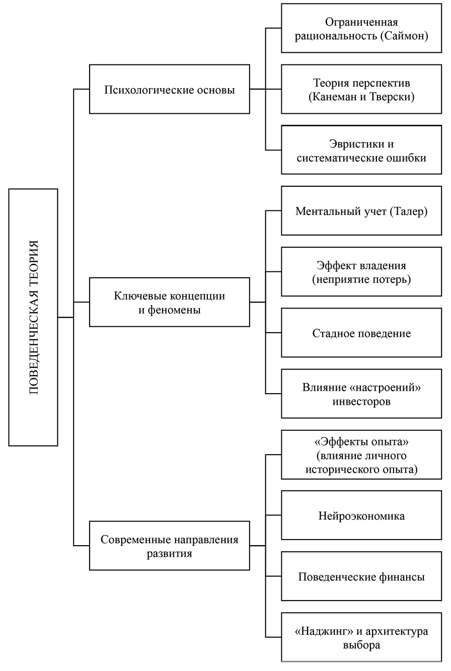 На рис. 2 представлена схема, иллюстрирующая структуру поведенческой теории финансов – от базовых психологических концепций до современных прикладных направлений.