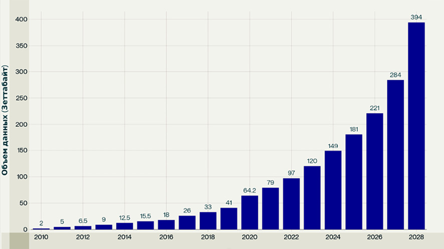 Рост объема создаваемых и потребляемых данных в мире (2010–2028) (в зеттабайт) Примечание: составлен авторами на основе источника: Statista. [Электронный ресурс]. URL: https://www.statista.com/statistics/871513/worldwide-data-created/ (дата обращения: 10.12.2025)