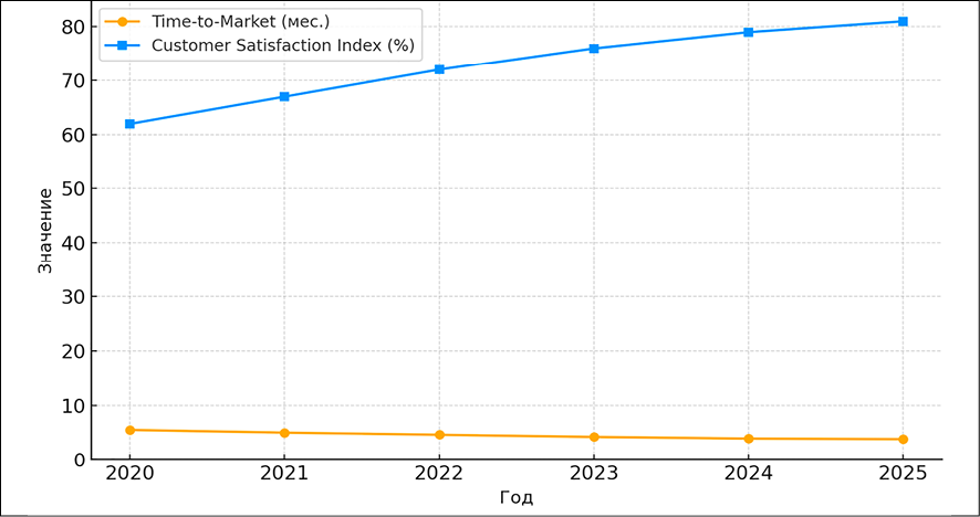 Эмпирический анализ 10 цифровых проектов, реализованных в период с 2020 по 2025 г., показал положительную динамику по всем ключевым показателям результативности: сокращение TtM, рост CSI, повышение вовлеченности и удержания сотрудников, снижение проектных рисков. Наряду с количественными изменениями выявлены качественные сдвиги в развитии командных компетенций – усиление автономии, доверия, инновационной активности и устойчивости.
